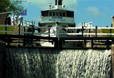 After crossing Lake Vättern we reach Borenshult, an important section of the canal with five lock chambers and a height of almost sixteen metres to overcome. This lock brings the history of the Göta Canal back to life, deep down below Lake Boren, and the joining together of the great lakes, Vänern and Vättern.